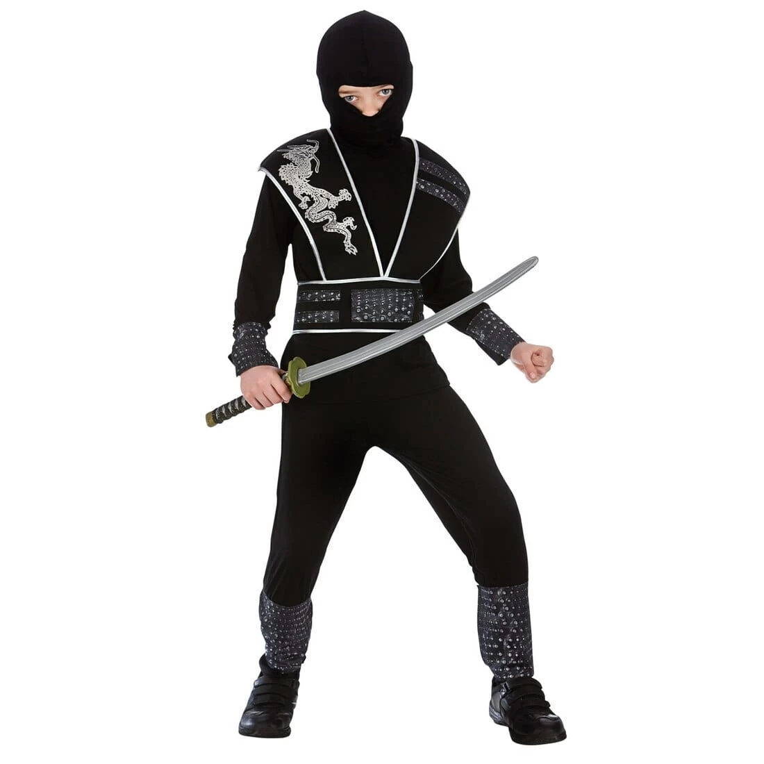 The costume includes a black shirt and trousers, black armour with silver dragon detail and trim, a black mask, and arm and leg guards.