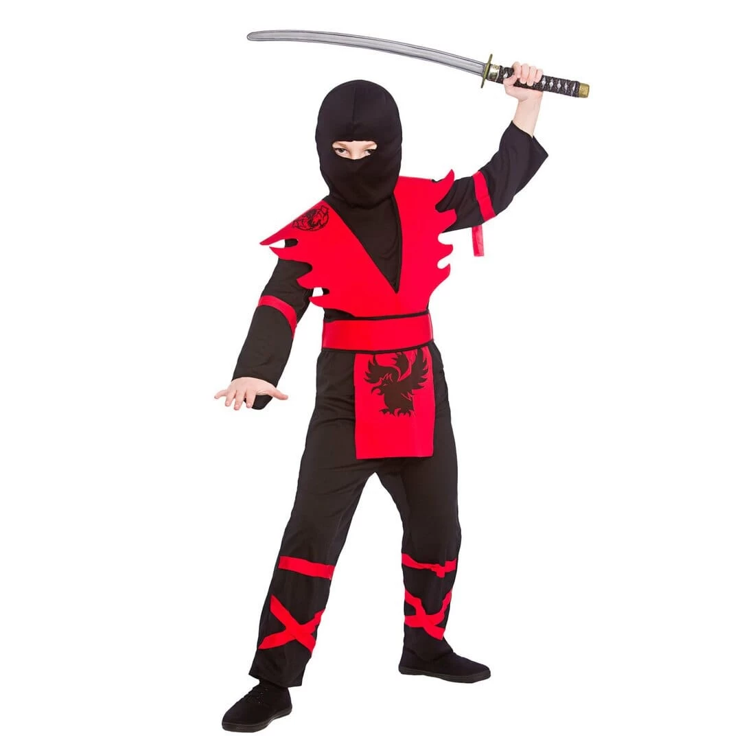 This kids Japanese fighter costume has a black shirt with attached colour armour with matching colour trim. The ninja outfit comes with black trousers, belt and hood.