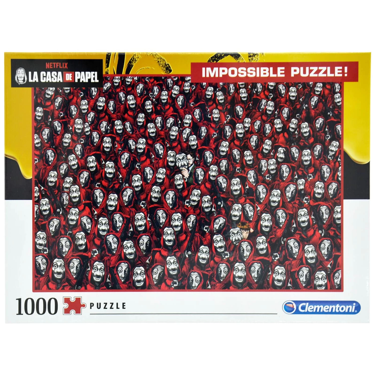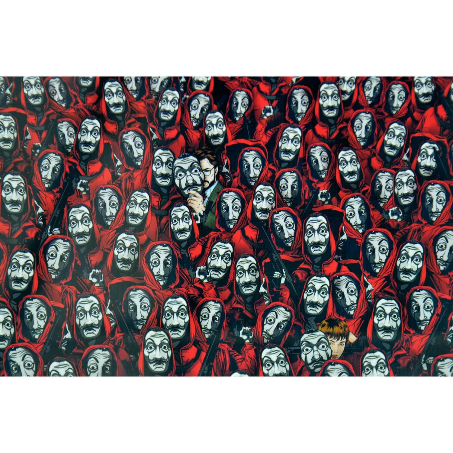 Based on the hit Netflix Spanish heist crime drama series La Casa De Papel this impossible puzzle features Salvador Dali masks with red hooded robes. Can you spot The Professor and Tokyo?