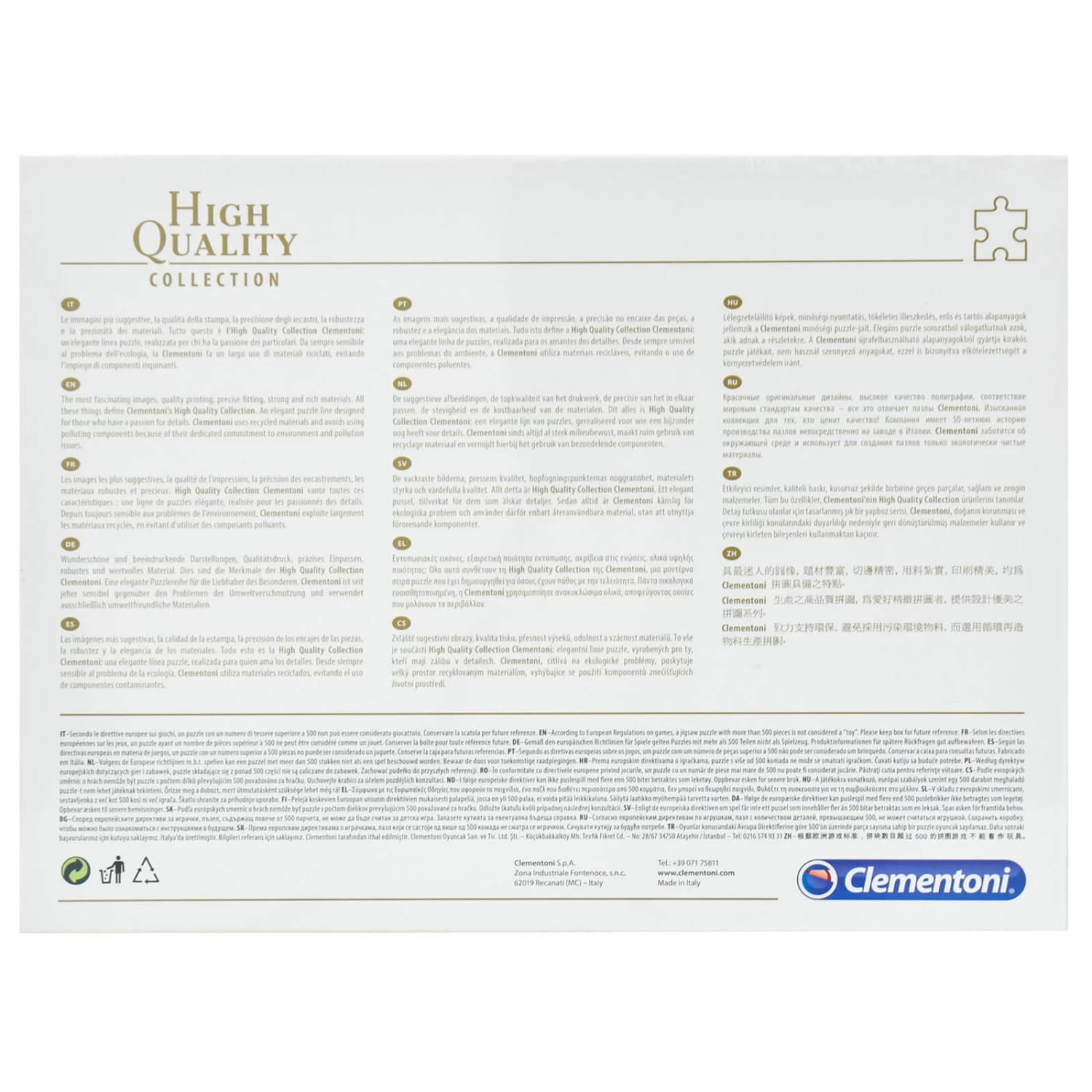 This premium quality jigsaw puzzle has 1000 pieces. The raw materials are sourced from recycled waste and controlled forests. Suitable for ages 10+