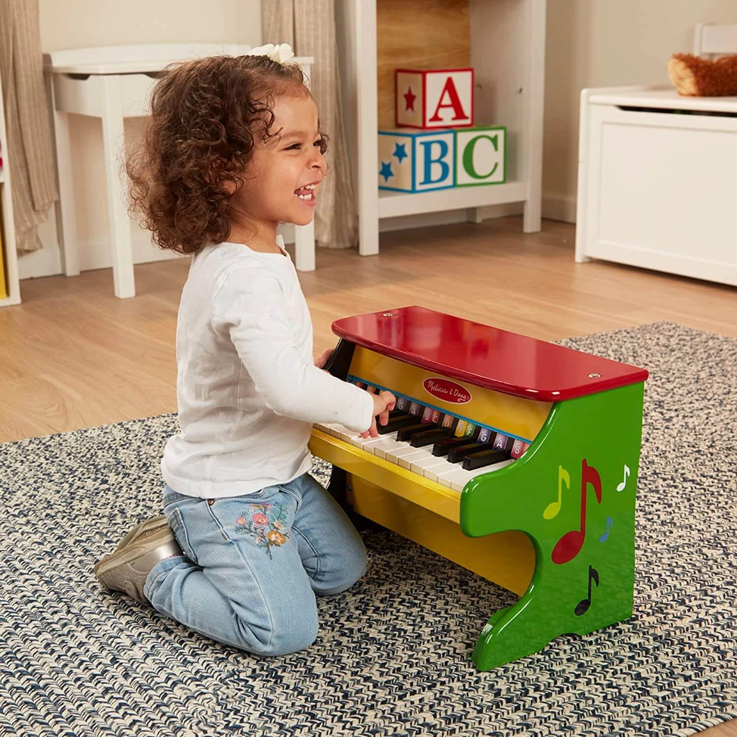 The piano toy features 25 keys and covers two full octaves providing lots of opportunities for creative expression. Your little musician will enjoy exploring concepts of high notes and low notes, loud and soft, and they’ll have a great time coming up with their own melodies and songs.