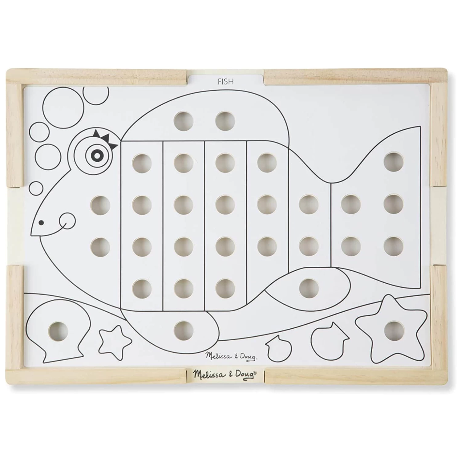 The Melissa & Doug Sort and Snap Colour Match has ten reversible picture cards that are held in place on a wooden play board when children place the snap caps in the holes. On one side of the picture card is in colour for matching. The reverse side shows the picture in black and white, allowing children to create their own patterns and designs!