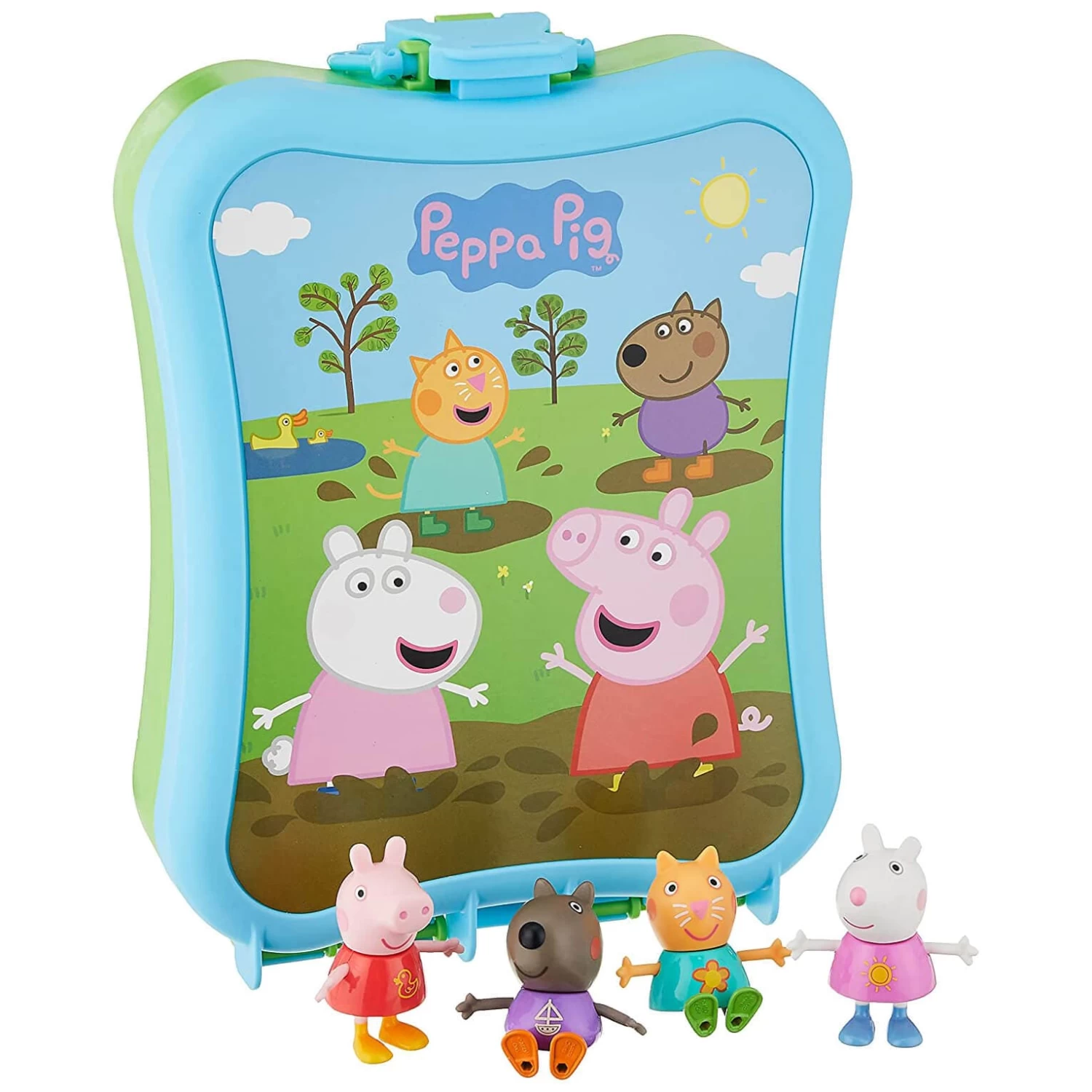 This set includes 4 figures inspired by the Peppa Pig animated series: Peppa Pig, Suzy Sheep, Danny Dog, and Candy Cat. Children will love to reenact scenes that they saw on tv or imagine their own fun adventures! When play time is done, tidy away the figures inside the adorable carrying case, ready for the next adventure.