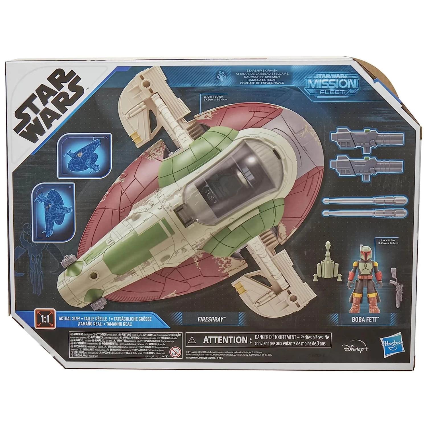 This Star Wars toy includes a 6.5cm (2.5″) scale Boba Fett action figure with fully poseable arms, legs, and head. The 28cm long Starship features a gravity-defying rotating cockpit, fuselage opening, and projectile ports to attach blasters. This Boba Fett toy includes 2 re-positionable blasters, 2 projectiles, a handheld blaster accessory, and an attachable jetpack accessory. Suitable for ages 4+